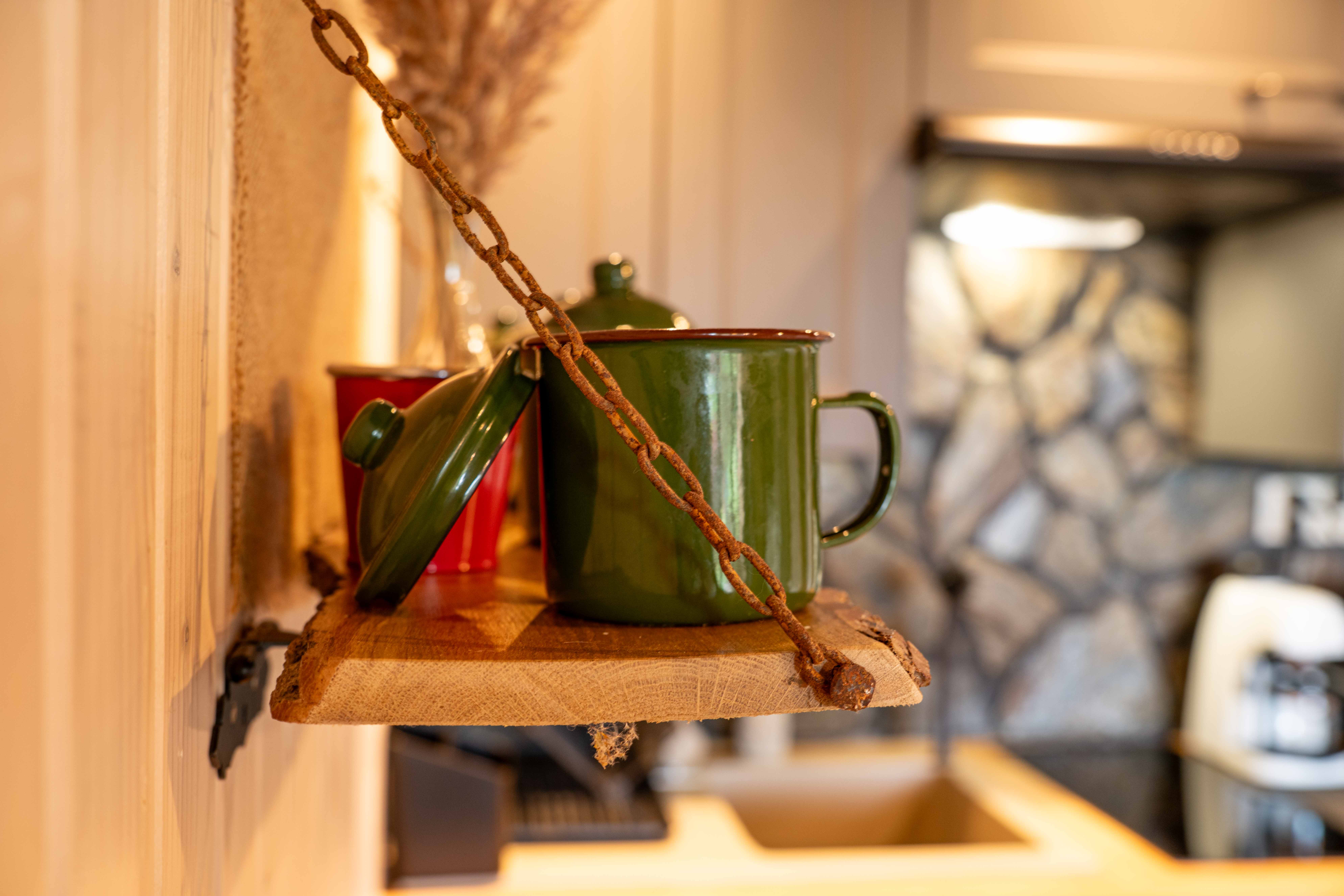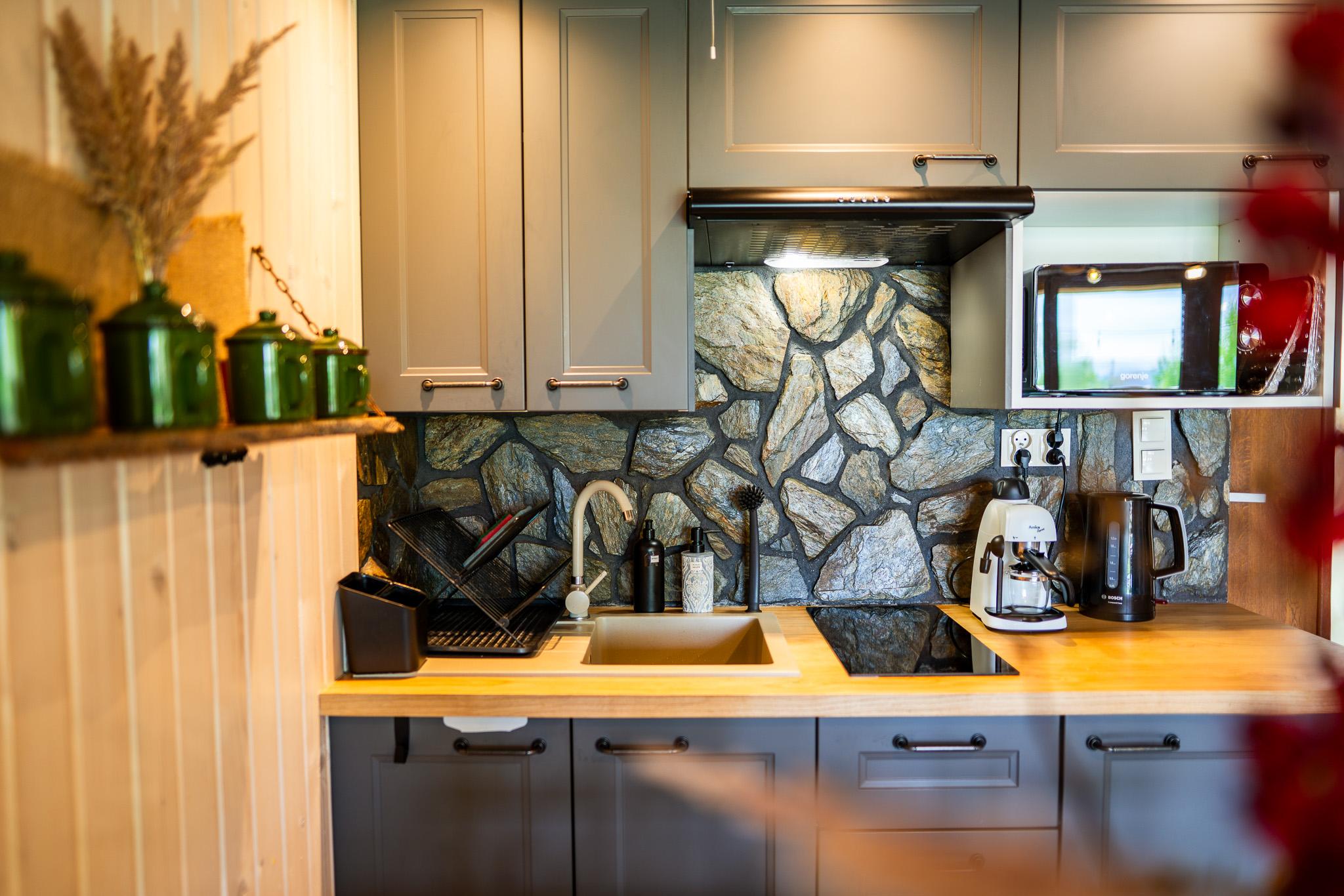 Aneks kuchenny wyposażony jest we wszystkie podstawowe akcesoria potrzebne do przygotowania codziennych posiłków, w tym: