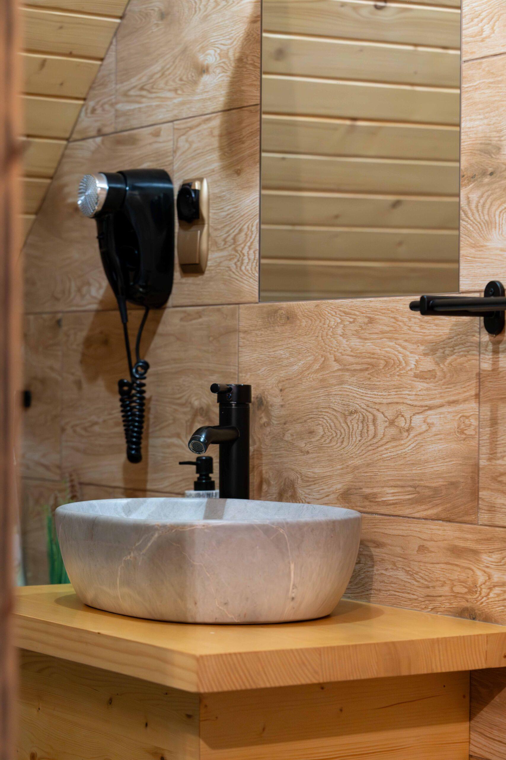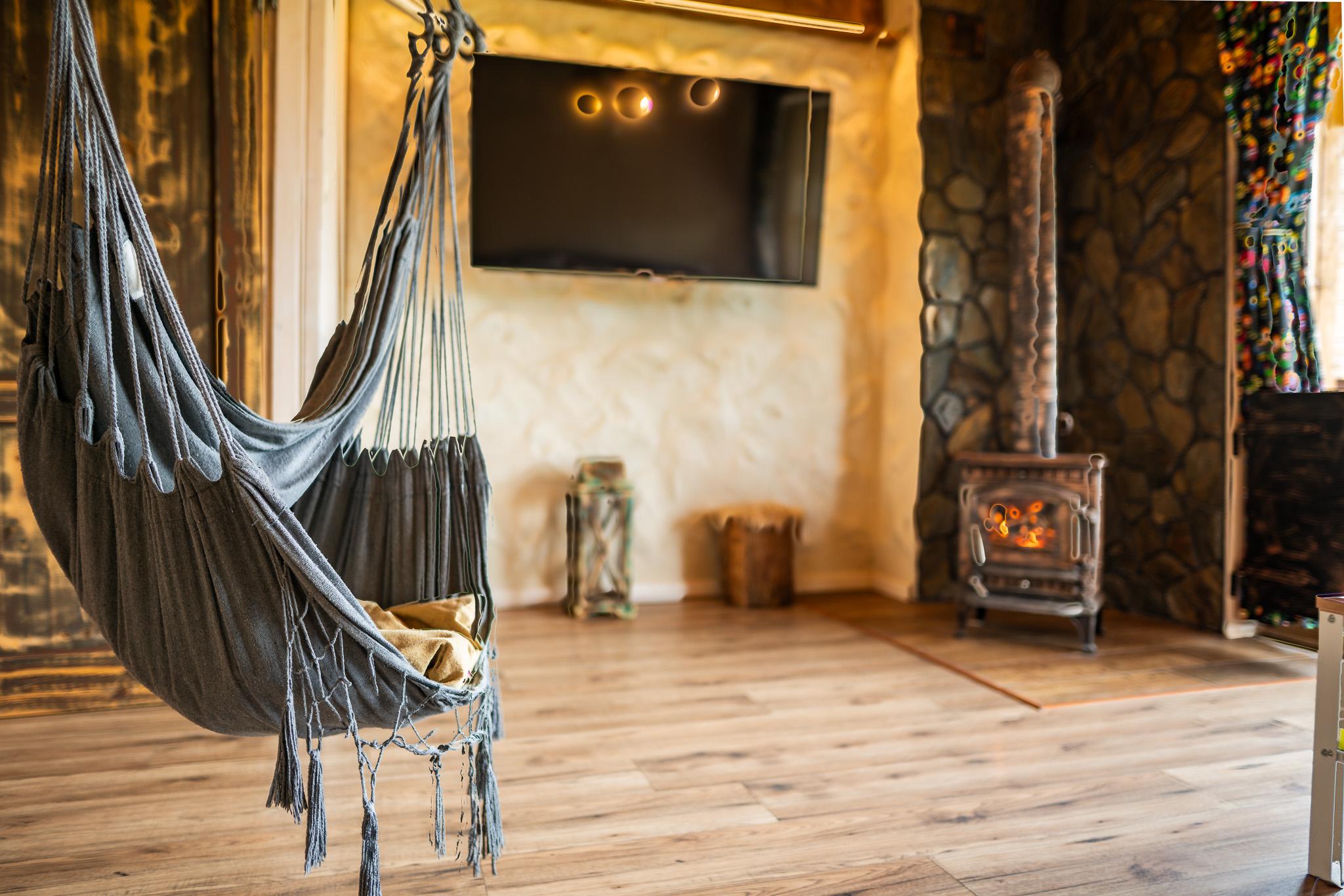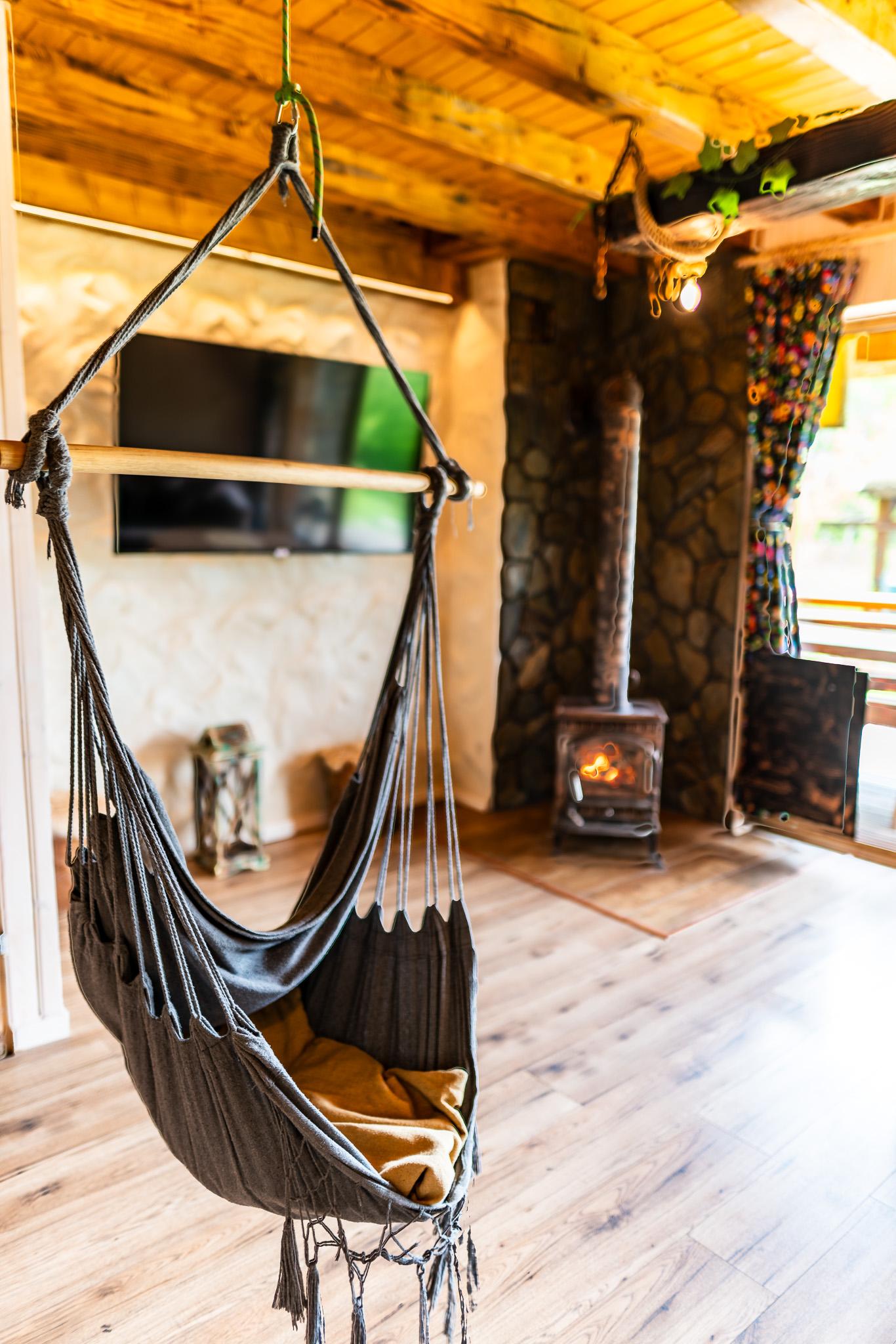 Na wprost wejścia umieszczony jest wolnostojący piec typu koza – centralny element wnętrza, którego tło stanowi naturalny kamień nadający przestrzeni wyjątkowego charakteru.