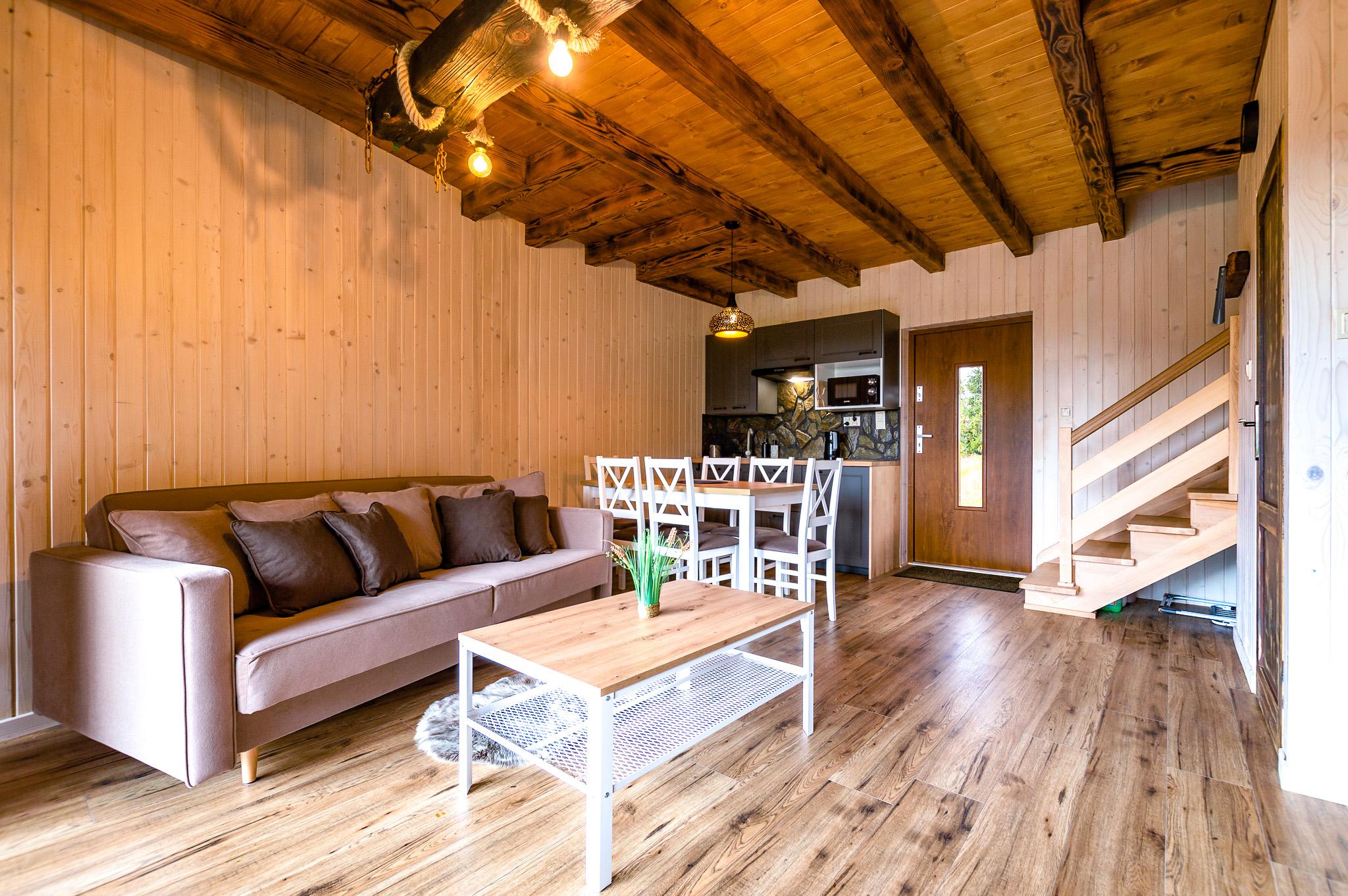 Przestronny i jasny salon w apartamencie jest połączony z aneksem kuchennym. Posiada wyjście na taras oraz schody prowadzące na piętro, gdzie znajdują się sypialnie. W salonie dostępny jest telewizor 55”, wygodny fotel brazylijski. Pod schodami znajduje się toaleta.