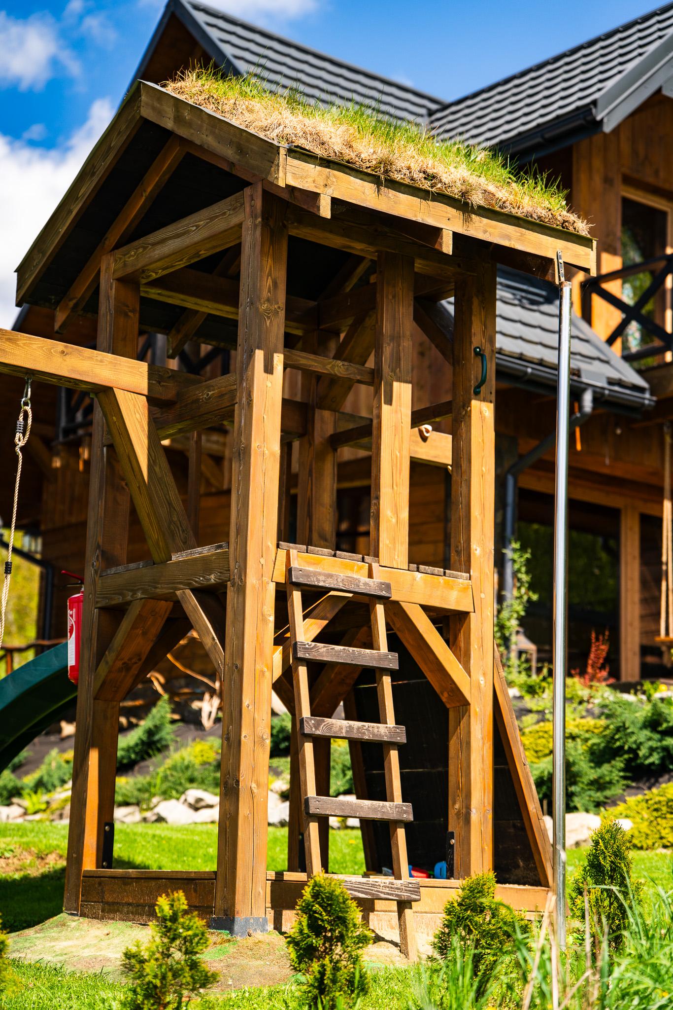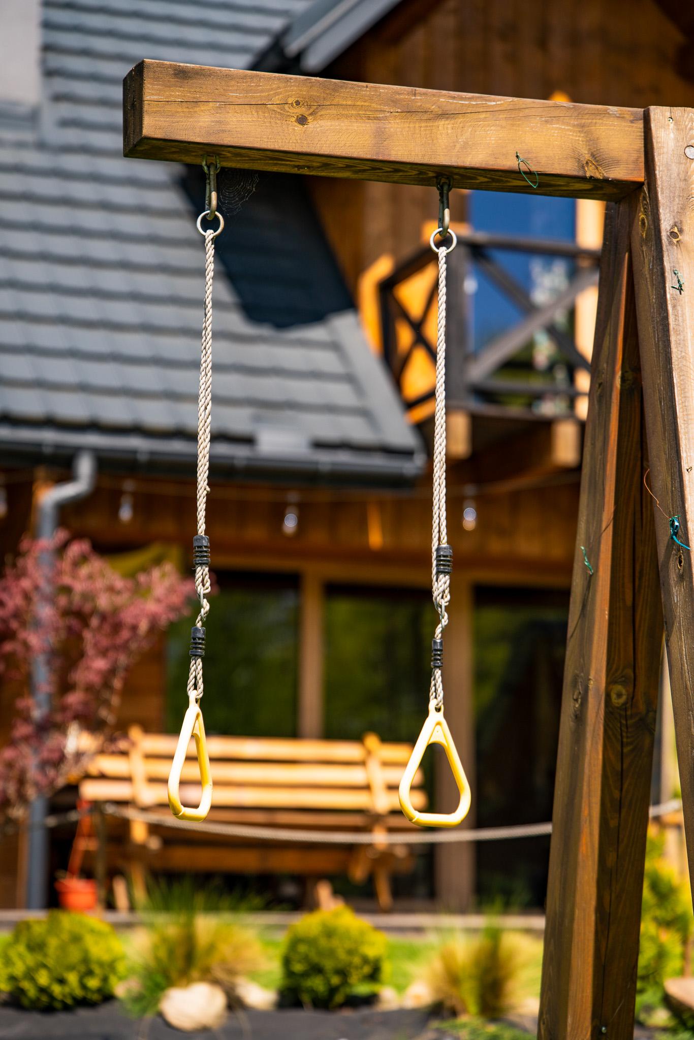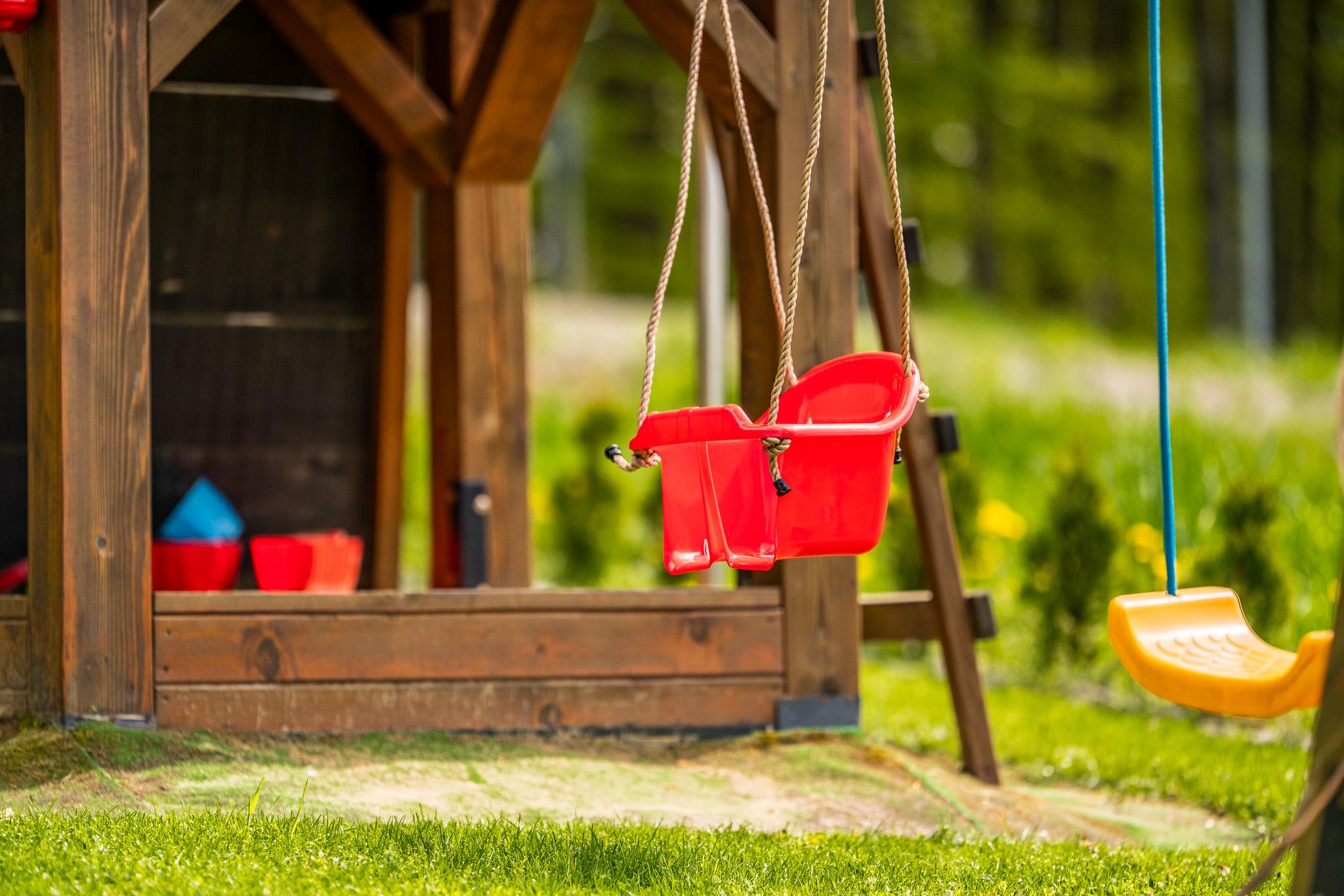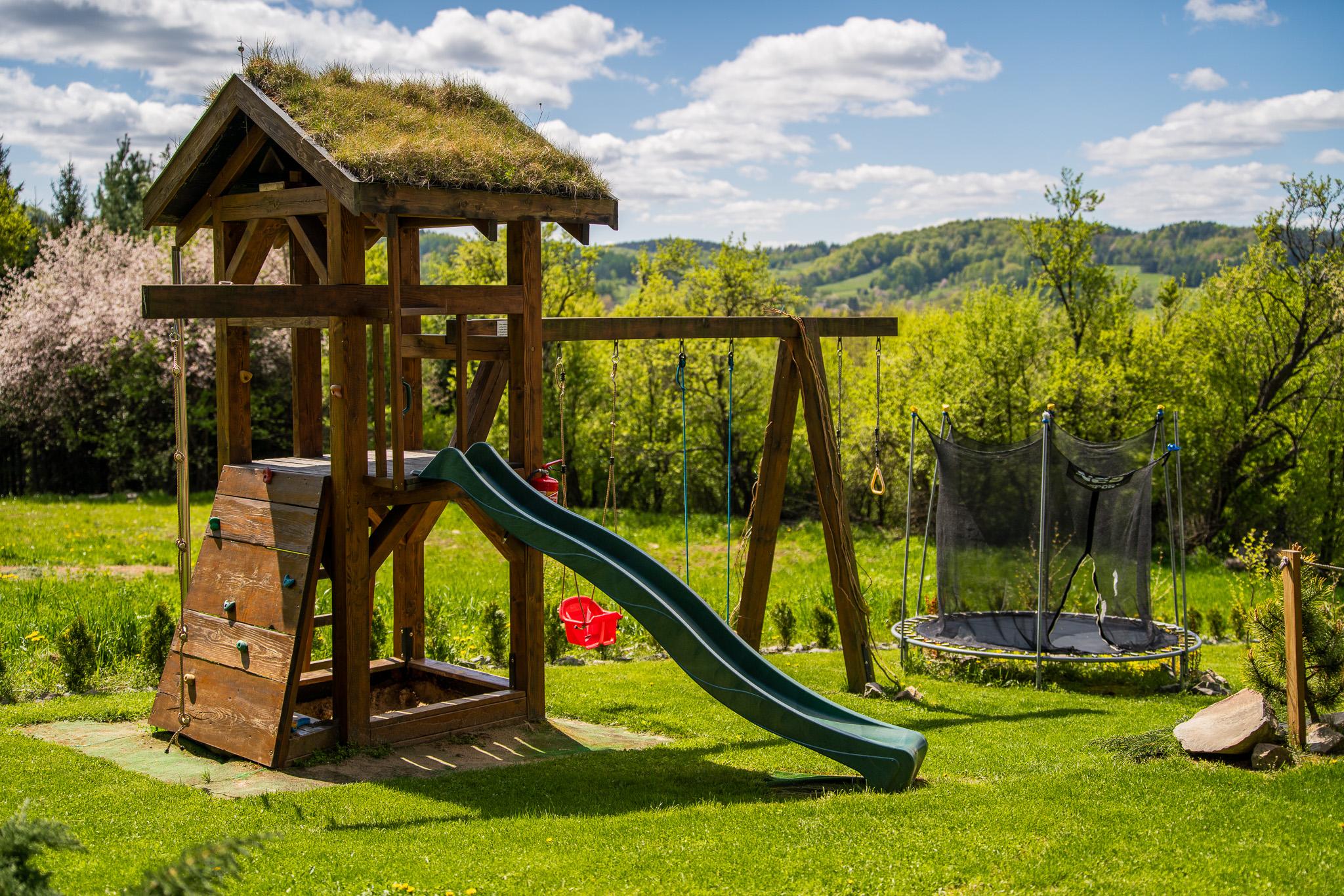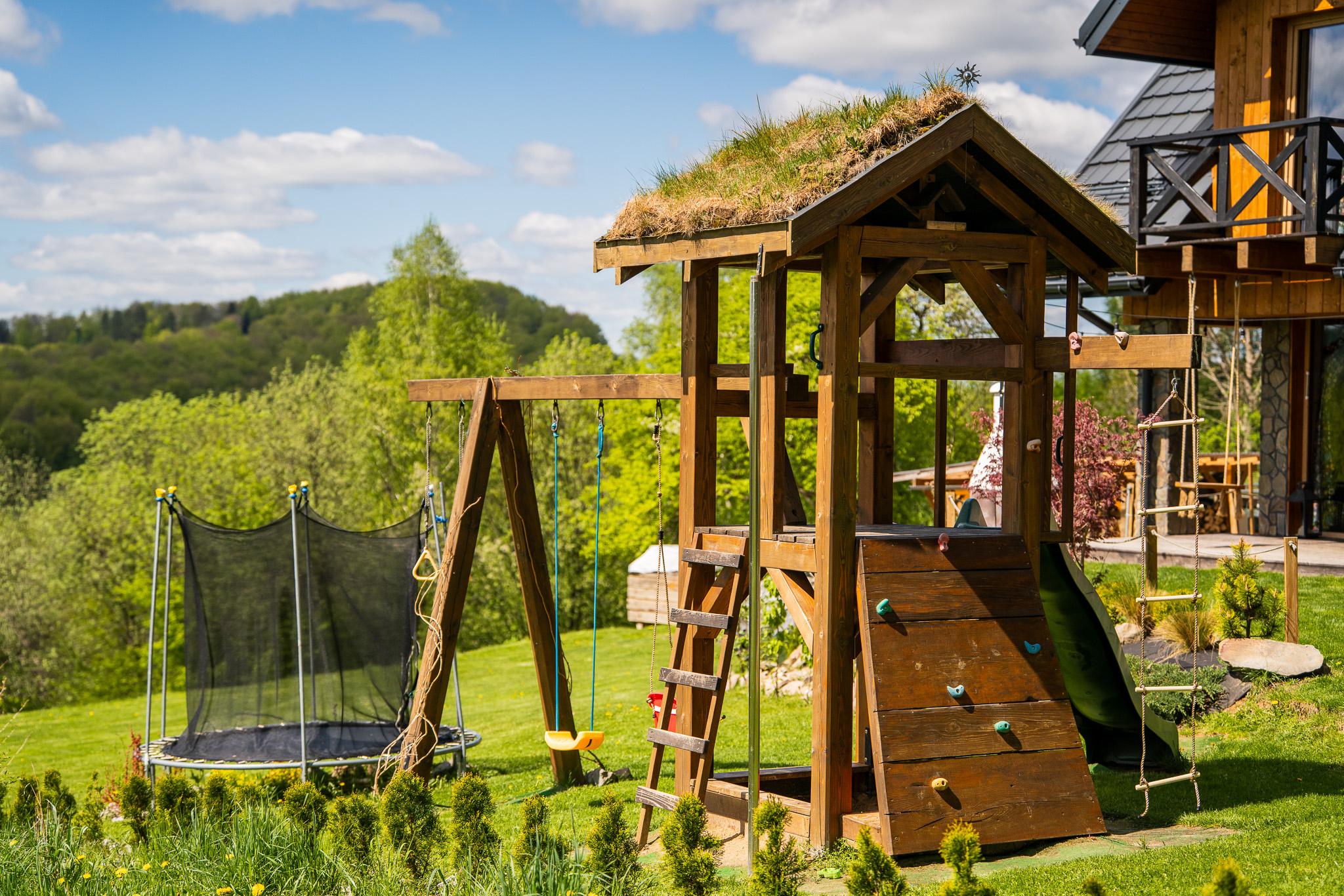 Większy plac zabaw, wyposażony w huśtawki, piaskownicę, zjeżdżalnię, ściankę wspinaczkową oraz trampolinę, znajduje się w bezpośrednim sąsiedztwie tarasów domków nr 2, 3 i 4.